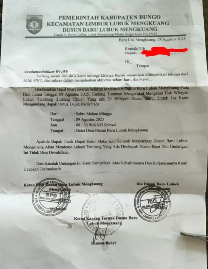 Masyarakat Dusun Baru Lubuk Mengkuang mengaku sangat terkejut dan tidak percaya awalnya karena diduga pemerintah dusun mendukung kegiatan PETI yang sejatinya kegiatan tersebut harus diberantas berdasarkan surat himbauan dari Bupati Bungo kepada seluruh Camat yang ada di wilayah Kabupaten Bungo, tertanggal 10 Juni 2025 yang lalu.