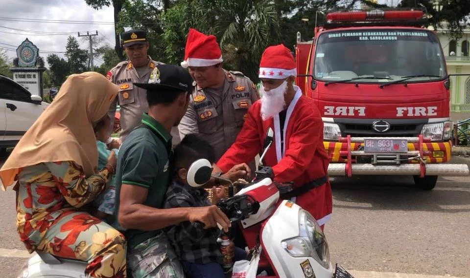 Ini terlihat dari kejutan istimewa menyambut hari Natal pada Rabu 25 Desember 2024, dengan mengenakan topi merah khas Santa Claus, personel Pos Pam Kecamatan Sarolangun yang dipimpin Kapolsek Sarolangun AKP Ilham Tri Kurnia. S.TrK, SIK memerankan sosok pembawa kebahagiaan.